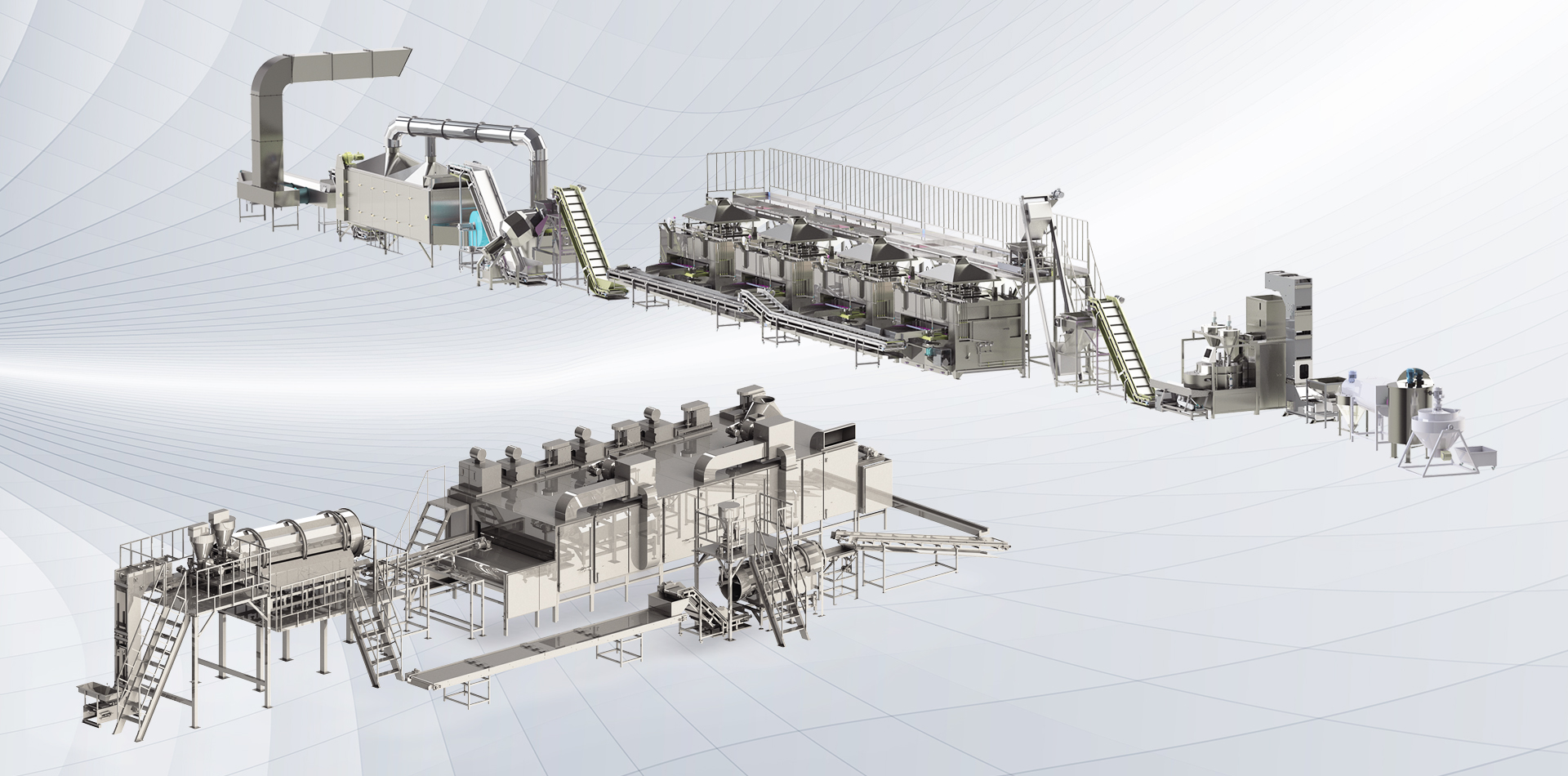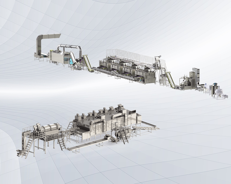 該生產(chǎn)線廣泛用于堅果、籽類、裹粉顆粒食品、薯片、薯條、膨化食品等加工生產(chǎn)。